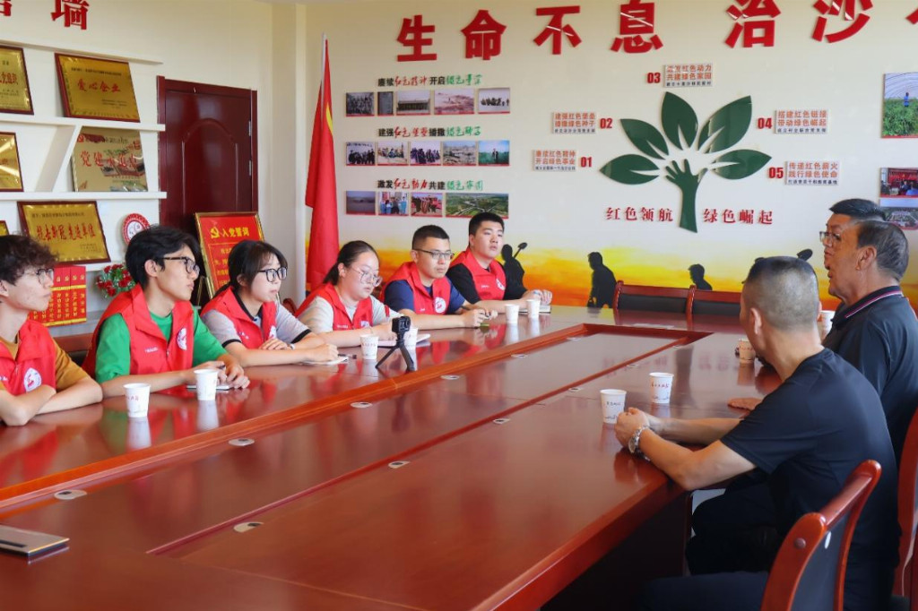参观结束后,实践团全体成员来到石光银治沙集团有限公司。已近耄耋之年的石光银老先生精神矍铄,结合自身四十余年治沙经历,向大家细数当年在荒漠中扎营、与风沙较劲的日夜,用“先固后治”策略在流动沙丘外围扎设草方格,内侧栽种耐旱的花棒、柠条,10 年间推平100 多座沙丘。为破解治沙资金难题,他创新“生态入股”机制,带领乡亲们在治沙林里发展红枣、枸杞产业。一旁的孙子石健阳则补充了治沙技术的迭代与产业转型故事,强调"认准方向就死磕"的韧劲与科学方法结合,才是治沙成功的关键,让成员们对治沙精神有了更鲜活的理解。榆林不畏艰难、勇于创新的治沙精神在石光银老先生爷孙三代中得到了传承和发扬。